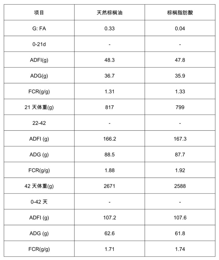 天然棕榈油脂和棕榈脂肪酸對不同階段肉雞生長(cháng)性能(néng)的影響詳見表3.由表可(kě)見在日增重和料肉比方面各階段天然棕榈油脂均略好于棕榈脂肪酸。