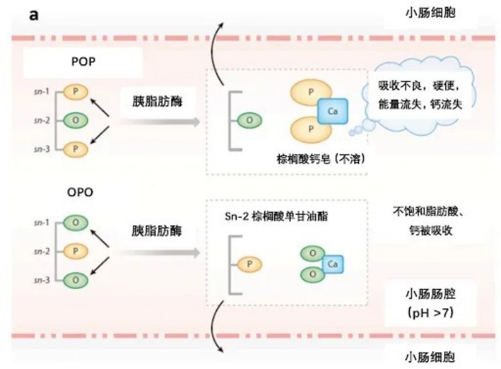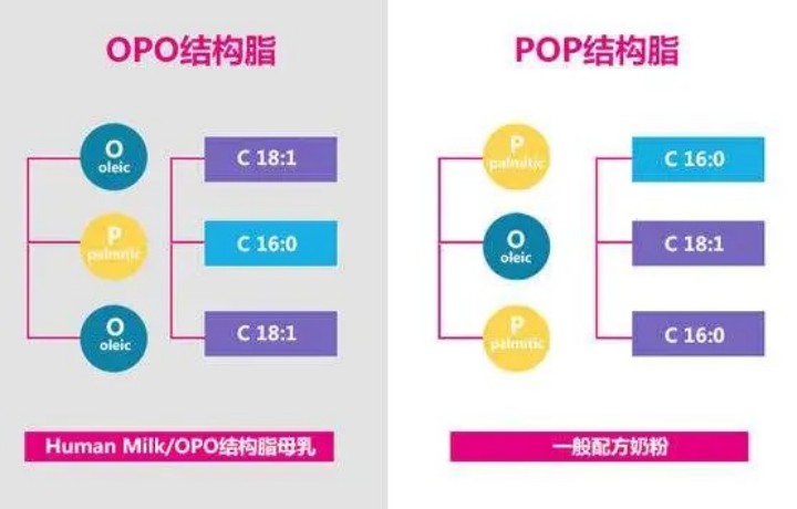 其次,母乳中(zhōng)60-70%的棕榈酸(C16:0)0和油酸(C18:1)結構是以“OPO的結構”,即甘油三酯中(zhōng)一三位是結合油酸為(wèi)主,二位結合棕榈酸為(wèi)主,這種結構比我們常見的植物(wù)油中(zhōng)的POP結構,更适合嬰幼兒消化吸收。